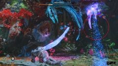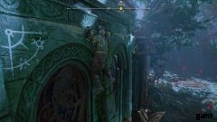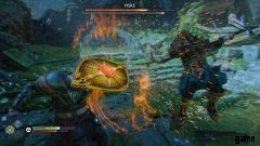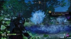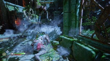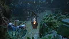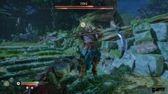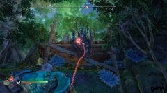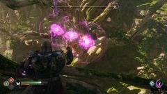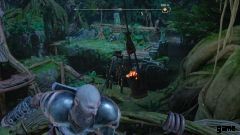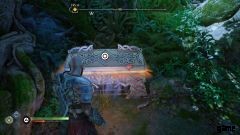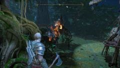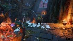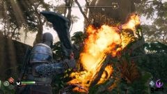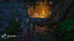 Once you clear out the poison, take your next left, destroy the vines, and open another chest. Head back to the main path, fight a few Wisps (you can only damage them after hitting them with Freya's arrows), and then head into the next area. You will watch a brief cutscene. Now go interact with the Lore Tablet and move on to the next area. Here you will find a chest that is being protected by a plant. Set the bulbous section of the plant on fire, and you will be able to get to the treasure chest.