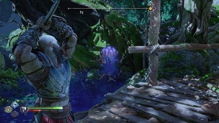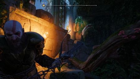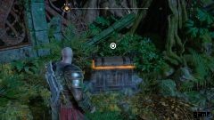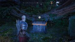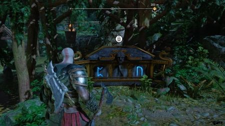 Nornir チェストの最初のルーンは左側にあります。 Blades of Chaos で火鉢に点火するだけです。 2 つ目のルーンは、バケツを自分の方に引っ張ったときにすでに取得していたものです (そうしなかった場合は、戻って、左側の棚に立っている間にバケツを自分の方に引っ張ってください)。 3 番目のルーンは、茨を一掃した橋の右側の木に挟まれています。バケツが木の前にぶら下がるようにクレーンを動かし、木に向かって引っ張って火鉢に火をつけます。 それで十分です。チェストから Idunn Apple を取りに行きましょう!