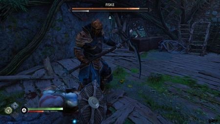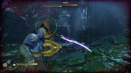 Fiske がゆっくりとあなたに向かって歩いてきたら、彼に向かって斧を投げます。次に、彼があなたに向かってスイングし始めたら、攻撃のタイミングを計って受け流します。 各パリーは、コンボを着陸させる機会を与えてくれます。 その間、あなたはその証拠となる赤いリングを探しています。あなたがそれを見るとき、あなたは横に転がります. そうでない場合、彼は剣を上げて地面に突き刺そうとしています。彼が突き刺すようなスタンス (槍を頭上に上げ、先端をあなたに向ける) をとったら、できるだけ突き刺し攻撃をかわす準備をします。あなたならすぐにフィスケを倒せると確信しています。