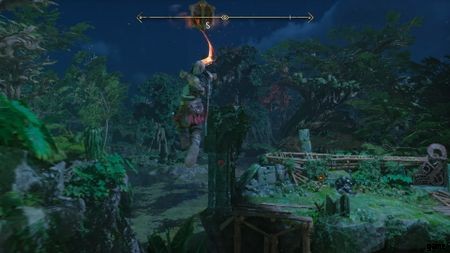 クレーンの後端にあるグラップル ポイントを使用して、左側の島に向かってスイングします。さて、あなたが島にいる間に、クレーンを回して (上のターゲットを斧で叩いて) バケツがあなたと反対側のイバラの間にあるようにします。 あとは、ブレードでバケツを手前に引き、手放します .それはブランブルに向かって右にスイングし、それらに火をつけます。棚に戻り、クレーンを回して、グラップルポイントがあなたと途中のドックの間にあるようにして、グラップルを渡ります.しかし、クレーンはまだ完成していません。橋を渡ったら右に曲がり、ノルニルの宝箱に向かいます。
