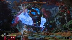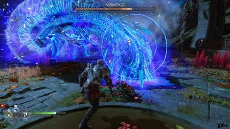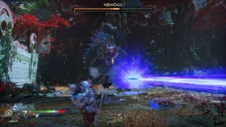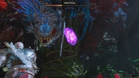 This is where the boss battle gets real . You will now have Freya aiding you, but Nidhogg will be far more dangerous now. Nidhogg will go to one of three spots on the screen. Whether he is coiled around a stone pillar, or perched on the edge of the arena will dictate his moveset. When he is wrapped around either of the stone pillars, it will fire a beam of Bifrost energy from its tail. It will sweep its beam firing tail across the screen, back and forth. You just need to roll through it. Beyond that, it will create rifts in space and time which it will use to stab you with its tail. Just stay mobile and roll away from the tail attack. If Nidhogg raises its tail and a yellow indicator ring appears around it, a projectile is about to be shot at you. Just parry it or dodge it; either way, these projectiles are slow.
