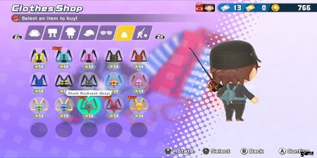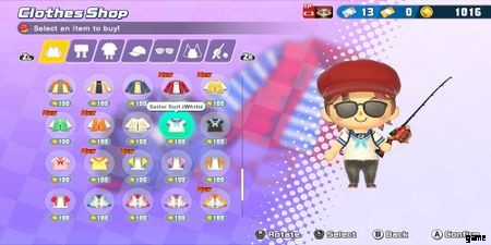 お店のレイアウトはキャラクタークリエイトモードの衣装メニューと同じです。まず、ZLボタンとZRボタンを使って服のカテゴリーを切り替えます。次に、メダルを使ってお気に入りのピースを購入 (価格は各アイテムの下にあります)。アイテムを購入した後、すぐに装備するか、後で使用するために保存するかを選択できます。