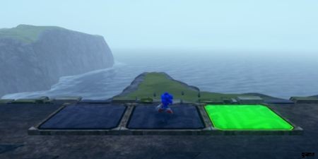 エッグマン着陸地点に向かって北に目を向けると、崖の端を過ぎたところに動くプラットフォームがいくつか見えます。それぞれ中央にボタンがあります。 3 つすべてを押す