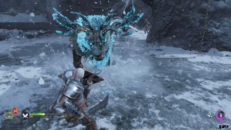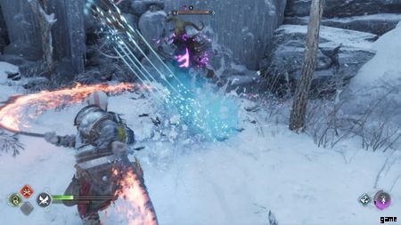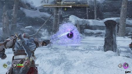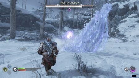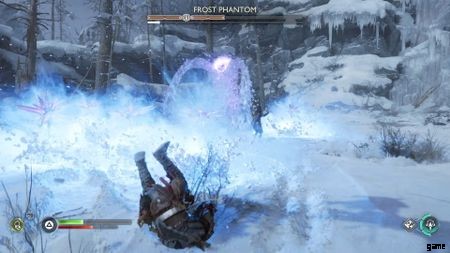 The Frost Phantom has a melee combo as well. They will first whip around horizontally, and then slam down vertically. This has an enormous range. That being said, in this fight, you never need to be that close to the Frost Phantom. Your goal is to throw your axe at the Frost Phantom's rune from a distance.
