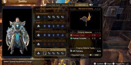 このクエストを完了すると、火竜と火竜を狩った通常の報酬と、特別なメガネ チケット 1 枚を獲得できます。 . モノクル オブ クラリティ レイヤード アーマーのロックを解除します 鍛冶場でのクラフト用。このレイヤード アーマーを作成するには、次の材料が必要です。