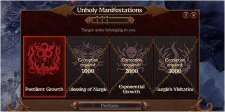 すべてのケイオス デーモン派閥と同様に、ナーグルは 4 つのアンホーリー マニフェステーションを所有しています。 . 儀式に似ている 以前のタイトルでは、これらは強力な効果を提供するために使用でき、その後のマニフェステーション 腐敗が十分に蓄積されると、ロックを解除できます .あなたの徴候 あなたが アセンダント になると、 が強化されます ザ・グレート・ゲームで .