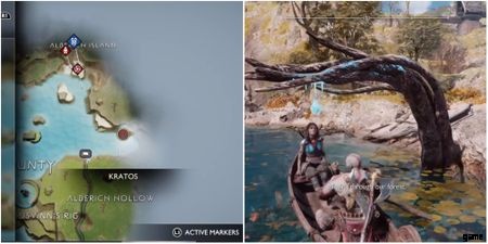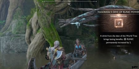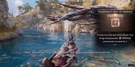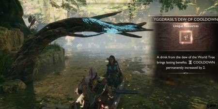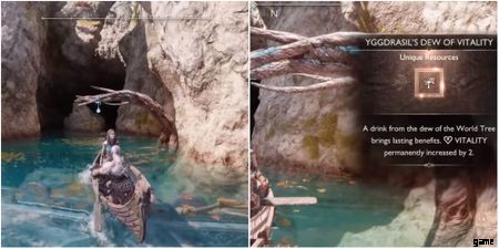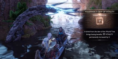 チェーンを登り、上部にあるルーンスレートを操作 .それを彫って、指示されたボタンを押して、ゲートを遠くに下げます。ボートに戻り、遠くにあるぶら下がっている枝に向かいます。集めるとユグドラシルの活力の露が手に入ります . 活力を恒久的に増加させます