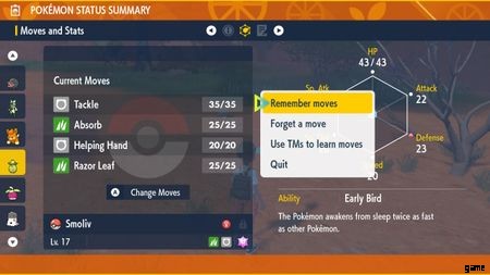 ポケモンのわざを変更するには: Check Summar メニューから、右方向ボタンを押します 現在の移動メニューに入るまで。ポケモンの動きとステータス ポイントを示すグラフが表示されます。 A を押して動きを変更 .