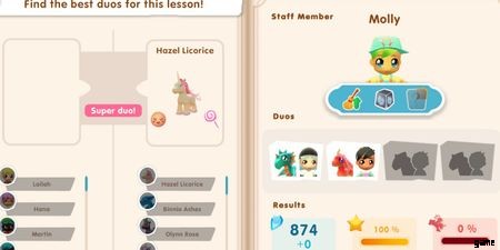 - すべての生徒は、ゲームに登場する 2 種類の生き物 (ドラゴンとユニコーン) のうち、好きな種類の生き物を示すデフォルトのバッジを持っています .クリーチャーのタイプとそれが好きな生徒を組み合わせると、スーパー デュオが作成され、レッスンからの宝石の出力が増加します。