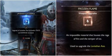 リヴァイアサンの斧 ゲーム開始時から持っている主要な武器の 1 つです。武器をアップグレードするには、凍った炎が必要です。 クラフト素材です。 ゲームには 8 つの Frozen Flame があります。 これを使用して、斧をレベル 9 にアップグレードできます。炎は見逃せないので、ストーリーのほとんどの炎を獲得します。ただし、いくつかの場合は、サイド ミッションを完了したり、ボスを倒したり、アイテムを獲得するために 9 つの領域に足を踏み入れたりする必要があります。