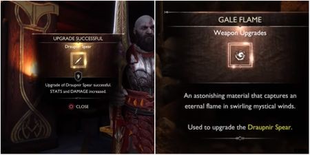 ドラウプニルの槍 クラトスの遠距離武器として機能 .メインストーリーミッション「Forging Destiny」で獲得できます ." 武器のアップグレードにはゲイルフレイムが必要です .スピアを最大化する 4 つのゲイル フレイムがあります。