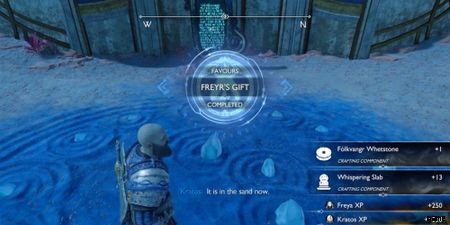 For the first Whetstone, you will have to make your way to The Forbidden Sands in Alfheim . Here you need to complete the Favor "Freyr's Gift ." You will get a Folkvangr Whetstone as a reward for completing the Favor.