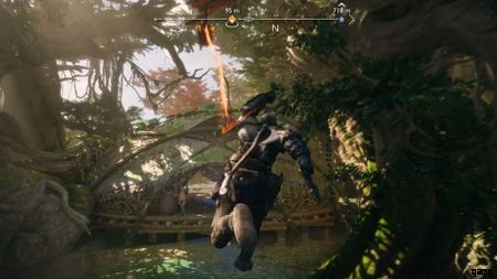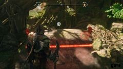 洞窟をくぐり抜け、道をたどります。槍で破壊できる別の石の壁に出くわします。さて、壁の穴を通り抜けたら、ただ 上を向いて右手を見てください。木の上にカラスがいます。