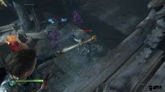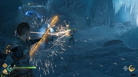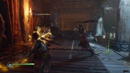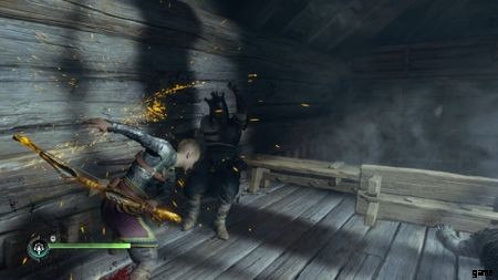 上に着陸したら、3 つの Einherjar と戦う必要があります。今回は助けてくれるスルードはいない。しかし、それらはすべて非武装であるため、繰り返しになりますが、簡単に受け流すことができます。この3つをクリアすると、矢が投げられます。次に、下の Einherjar を選択します。やがて床が崩れ、アトレウスは巨大なアインヘジャーに掴まれる。すべての意図と目的のために、居酒屋の戦いは終わった.トールが酒場から出るのを手伝うだけで、ニフルハイムに向かうことができます。
