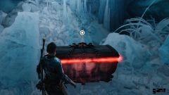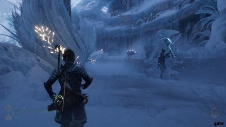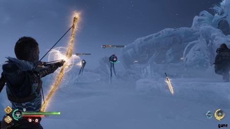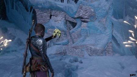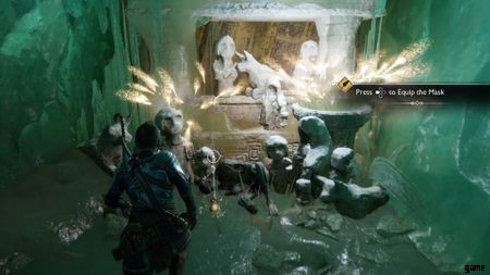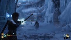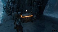 橋にぶつかると、ヘルウォーカーのグループに襲われます。 100 万回も対処していないものはありません。左側では、隆起した棚に飛び乗ることができます。ここにチェストがあります。 胸をつかんだら、飛び降りてメインパスに向かいます.広々とした部屋に入ります。部屋の反対側には、一連の発射物を投げつけるヘルウォーカーがいます。あなたの矢でそれらを取り出してください。彼らが死んだら、トールが残りを終わらせるのを手伝ってください.ここからは、アリーナの右隅に来たらマスクを取り出すだけです. トールがこの氷の壁を打ち破り、あなたは先に進むことができます。