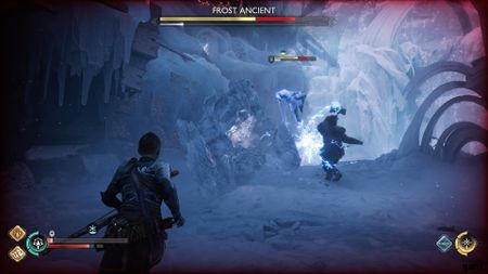 部屋の右隅に向かいます。右隅にある凍った破片の壁に向かい、マスクを引き抜いてください。 これにより、トールはその壁を破壊します。あなたは今、氷の洞窟に向かいます。ナイトメアはヘルウォーカーを所有しますが、アトレウスの優れた気絶能力とトールの自然の力との間では、これはほとんど障害にはなりません.こいつらを一掃すると、ナイトメアとヘルウォーカーの別のグループに出くわすことになります。それらを一掃したら、広いオープンエリアにドロップします。フロスト エンシェントと絡む時が来ました。
