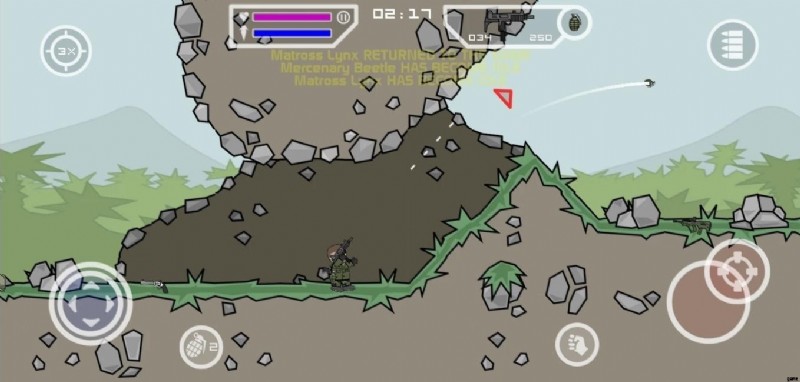 いくら喧嘩を避けようとしても、そう簡単にはいきません。 Mini Militia Doodle Army 2 のマップは小さいため、戦闘に参加する必要があります。負けた側にいる場合は、対戦相手または戦闘エリアの近くに手榴弾を投げてみてください。このように、あなたも敵を殺す可能性が大いにあります。その過程であなたも死ぬとしても、あなたのために殺害を確保する.