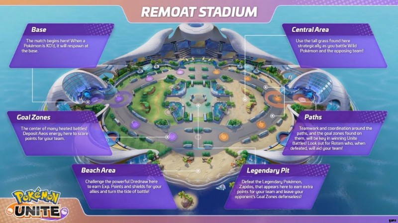 ゲームの目的を理解したところで、Pokémon UNITE のマップについて学びましょう。現在、Remoat Stadium、Shivre City、Aurorma Park、Mer Stadium の 4 つのマップが利用可能です。 4 つのマップすべてをすべてのゲーム モードで使用できるわけではないことに注意してください。シブレ シティ、オーロマ パーク、メール スタジアムは、クイック バトル ゲーム モードでのみ使用できます。