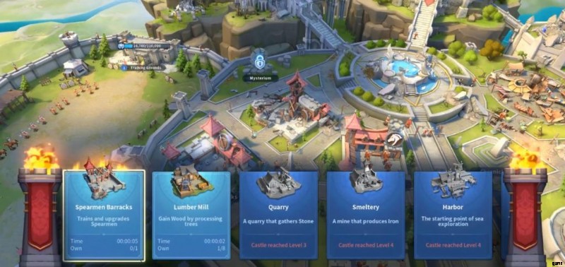 インフィニティ キングダムは戦闘だけではありません。それは都市を建設することでもあります。戦争を効果的に行うために使用および改善できるさまざまな建物があります。たとえば、病院は負傷者の治療に不可欠であり、農場は民間人が食べる食料を生産しています。ゲームの初期段階では高速ですが、これらの建物のアップグレードには時間がかかります。