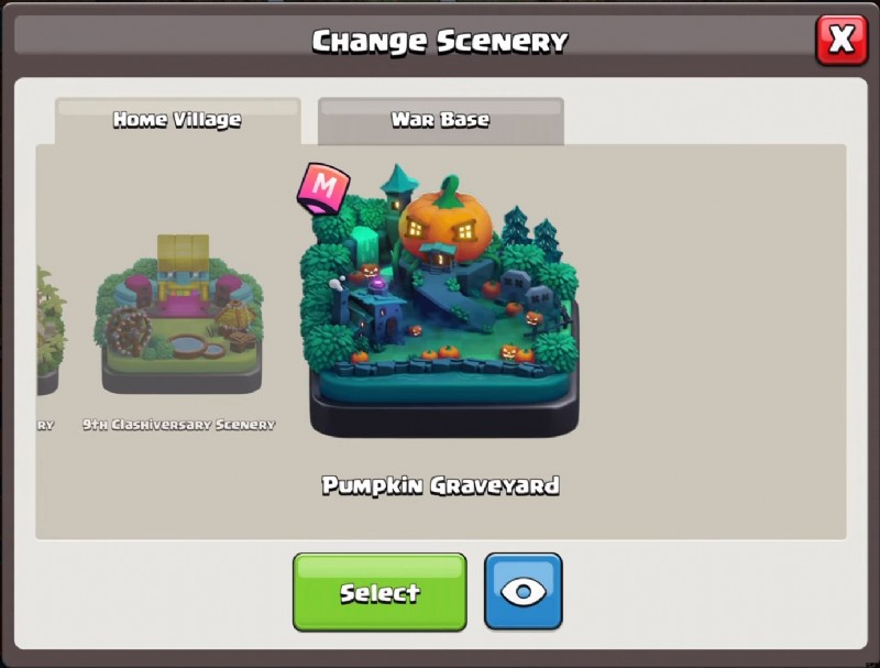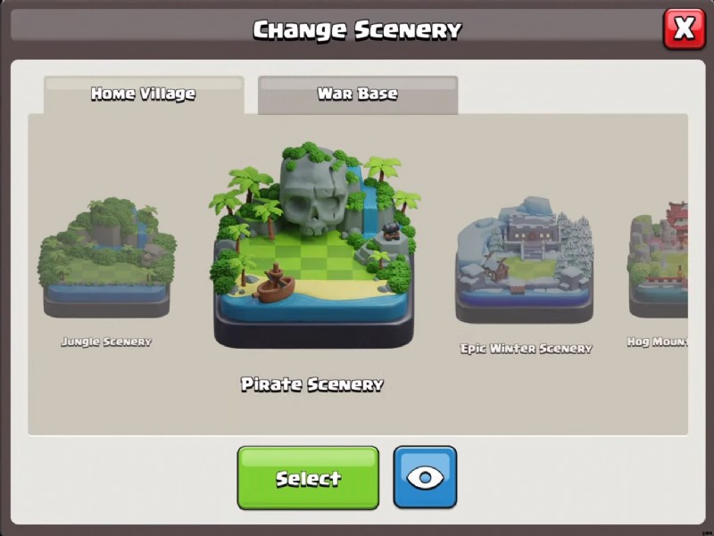 景色があることを確認したら、メインの村に進み、タウンホールを見つけます。そこから市庁舎をクリックすると、4 つのオプションが表示されます。情報、魔法のアイテム、アップグレード、景色の変更。 「風景を変更する」オプションを選択すると、購入して所有している風景に移動します。次に、使用するシーナリーを選択し、最後に「選択」ボタンで確定して、COC でシーナリーを変更します。