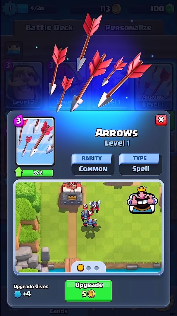矢のダメージは低いですが、このカードは群れや大群を排除するときに有益であり、より多くの機会を開きます.ほとんどの場合、矢印はチップ タワーとスポナー デッキを破壊するために使用されます。