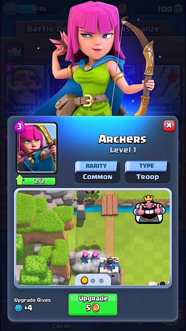 Clash Royale ビギナーズ デッキに入れなければならないもう 1 つのカードは、アーチャーです。これは、サポートとクラウド コントロールのための一般的な部隊カードです。このカードをスポーンすると、2 人の射手が解放されます。1 人は中距離で、もう 1 人は単一ターゲットです。