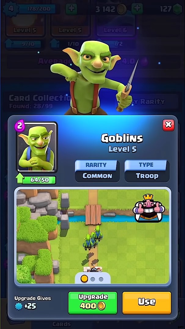 最初のアリーナでアンロックできる一般的な部隊カードはゴブリンです。このゲームを始めたばかりの場合、ゴブリンは単一ターゲットの部隊として効率的であるため、勝者のデッキの一部にすることをお勧めします。