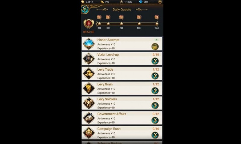 Game of Sultans には、探索できる定期的および毎日のクエストがたくさんあります。通常のクエストは画面の左隅に表示され、ほとんどが基本的なタスクで構成されています。クエストを優先することで、基地を強化するだけでなく、さまざまな報酬を得ることができます。一方、デイリークエストは、経験値と積極性を提供します。名前が示すように、デイリー クエストはリセットされる 24 時間以内に完了する必要があります。