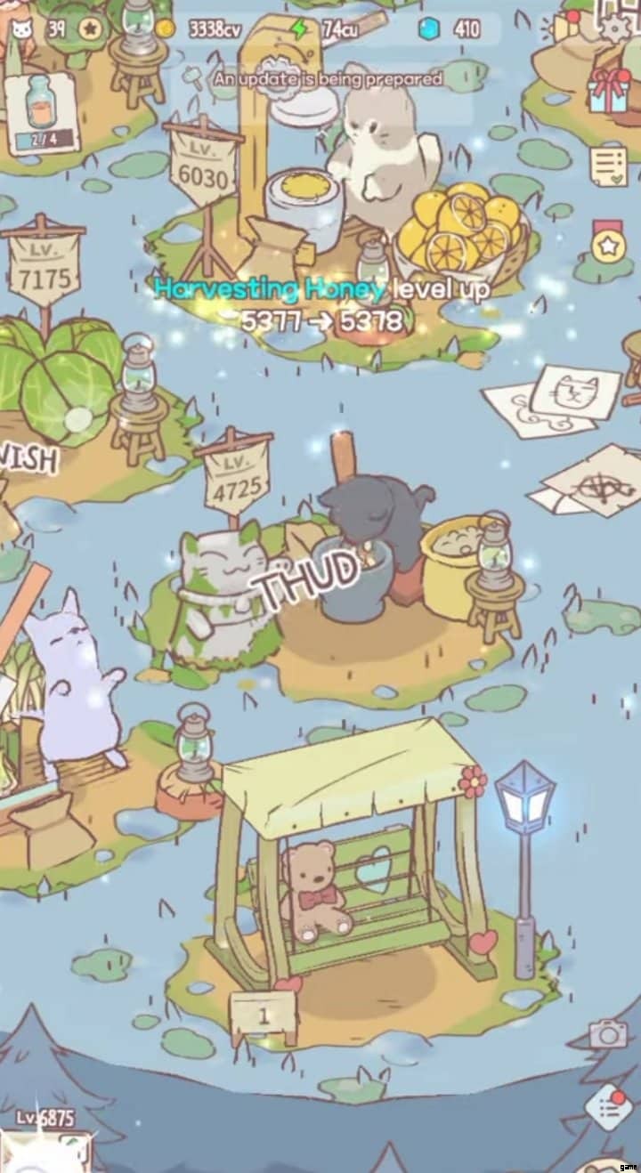 - 調理設備 – 猫の友達を置いて食べ物を調理する場所。より多くのゴールドを獲得するには、アップグレードする必要があります。レベル 1 から 10 にアップグレードすると、アイテムの価格が上がります。