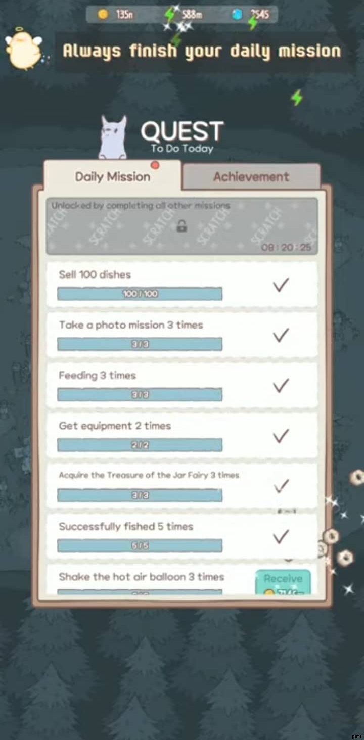 すべてのプレイヤーが考慮すべきもう 1 つの Cats &Soup ゲームのヒントは、デイリー ミッションの完了です。クエストを完了すると、ゴールド、レシピ ポイント、ゴールド チケット、レシピ ポイント チケットなどの追加報酬を獲得できます。また、毎日のクエストを完了すると、青い宝石を入手できます。青い宝石は、無料のオプションの宝箱がまだ利用できない場合に宝箱を開くのに役立ちます.