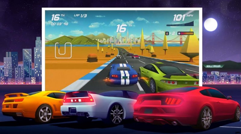 最高のレーシング ゲームの究極のリストに追加されるのは、Aquiris Game Studio の Horizon Chase です。あなたの視点をハイエンドのレーシングゲームと対比すると、レトロ風のレーシングゲームです。このレーシング ゲームでは、昔ながらのレーシング ゲームを体験できます。ここでは、車の後ろで遊んだり、20 台以上の象徴的なスポーツカーを運転したりします。