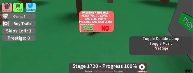 Mega Fun Obby でプレステージを行うには、右下の設定アイコンをクリックしてから プレステージ をクリックします。 [はい] をクリックします 、プレスティングを行うとレベル 1 にリセットされることに注意してください。