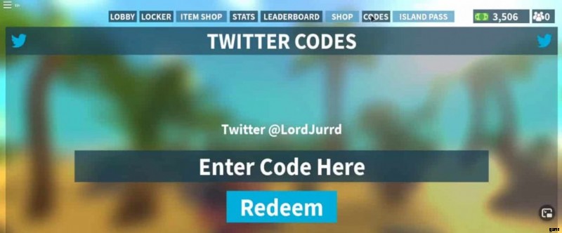 Island Royale のコードを引き換えるには、トップ メニューの [コード] をクリックし、[コードをここに入力] という領域にコードを入力して、[引き換え] をタップします。