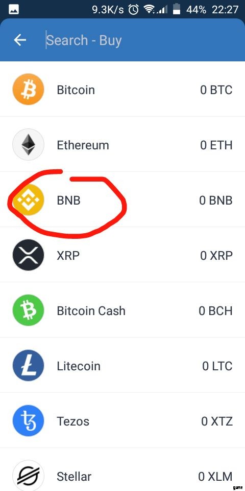 暗号通貨のリストが表示され、BNB を検索して選択します。