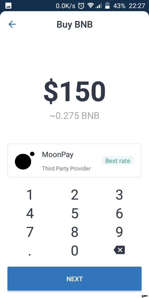 [次へ] をクリックします。私の場合は Moonpay に転送されました 電子メールを入力してアカウントを確認するためのコードを取得し、支払い情報を入力して注文を確認したウェブサイト。数分後、ウォレットに BNB を受け取りました。