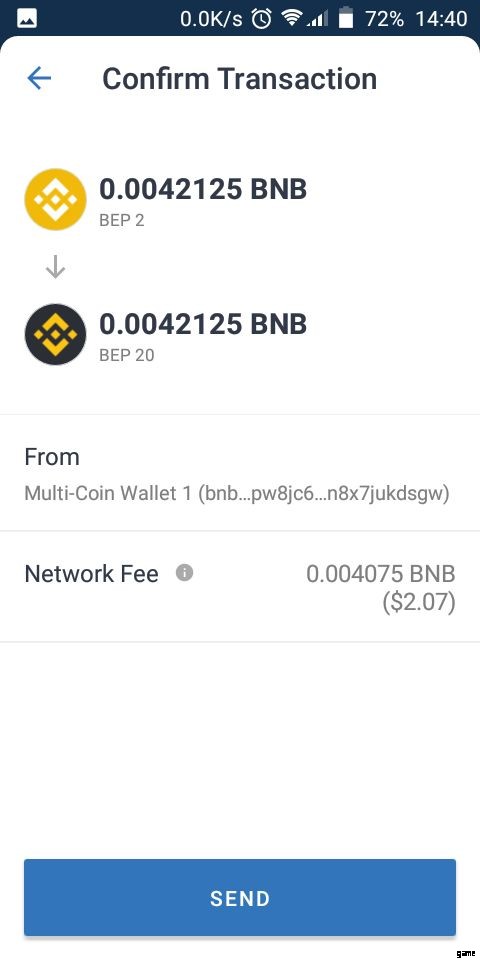 Safemoon 公式ガイドの購入方法にはこの手順が記載されていませんでした。このステップをスキップして 4 番目のステップに進むこともできますが、Pancakeswap で BNB 残高が不足しています というメッセージが表示される場合 . BNB をスマート チェーンに変換する必要があります。