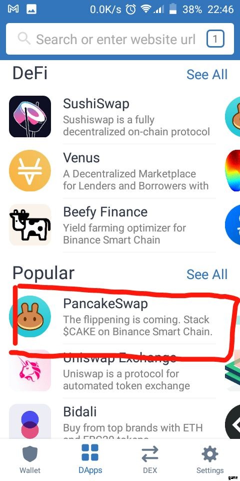 トラスト ウォレットの画面の下にあるメイン メニューで DApps をタップします。 下部のタブをクリックして、PancakeSwap を見つけます