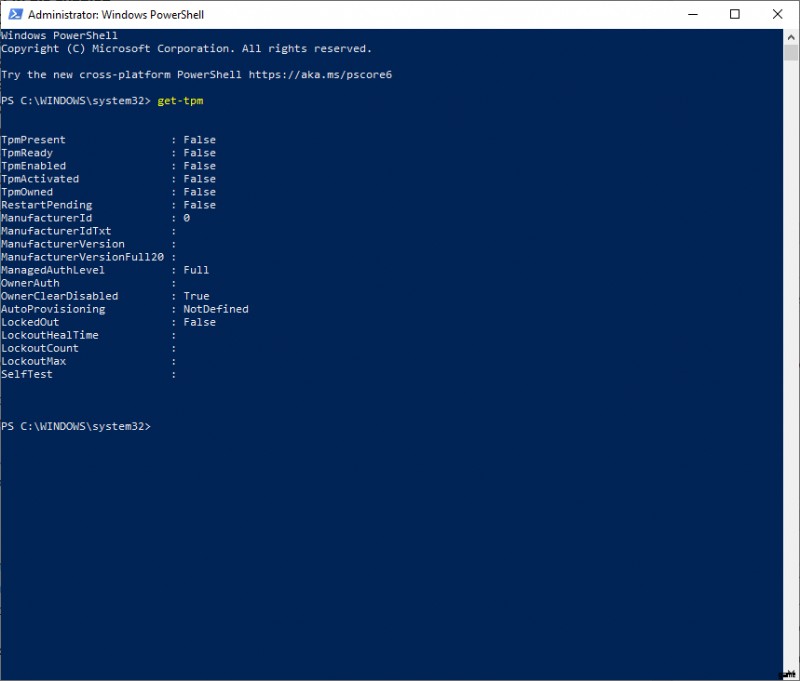 最初のステップでは、スタート メニューを右クリックし、[Windows PowerShell (管理者)] をクリックします。次に「get-tpm」と入力します。