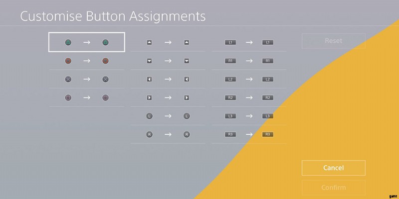 PlayStation 4 プレーヤーの場合は、設定メニュー、アクセシビリティ、ボタン割り当ての順に移動します。ここでボタンを再マッピングできます。