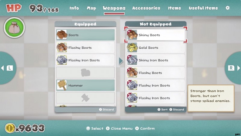 あなたが持っているという理由だけで 武器であっても、戦闘で使用できるわけではありません。ポーズ メニューから武器を手動で選択して装備する必要があります。ペーパー マリオの基本的な攻撃に加えて、最大 3 つのブーツと 3 つのハンマーが必要です。
