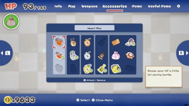バトルアクセサリーから、ハートプラスを1つ、ガードプラスを1つ、タイムプラスを1つ装備できます。次に、オープン ワールドでは、Alert Accessor の 1 つを装備でき、Miscellaneous Accessories の 2 つを装備することを選択できます。