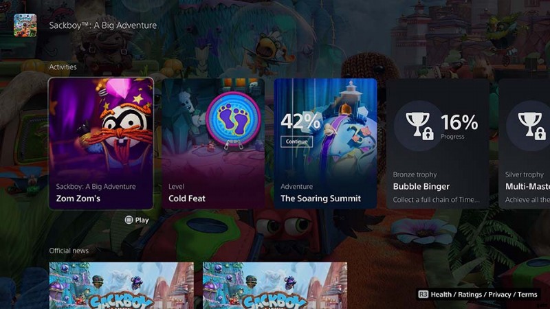 トロフィー ハンターを喜ばせる新しい PS5 機能の 1 つは、ゲーム ヘルプです。これはアクティビティ カード システムの拡張機能であり、PS5 プレイヤーがゲーム内の特定の目的を達成するのに役立つヒント、画像、ビデオをカードに添付できるものです。ソニーは、Sackboy:A Big Adventure でこの機能を最初に披露し、ゲーム ヘルプ ポップを開いて特定のステージの収集可能なガイド ビデオを開きました。これがどのように実装されているかは、開発者に依存することがよくありますが、これを利用するのはファースト パーティのゲームだけではないことを願っています。