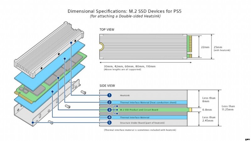 - 冷却構造 :PS5 本体で M.2 SSD を使用するには、ヒートシンクなどの冷却構造による効果的な放熱が必要です。片面フォーマットまたは両面フォーマットのいずれかで、M.2 SSD に自分で取り付けることができます。冷却構造 (ヒートシンクなど) が組み込まれた M.2 SSD もあります。