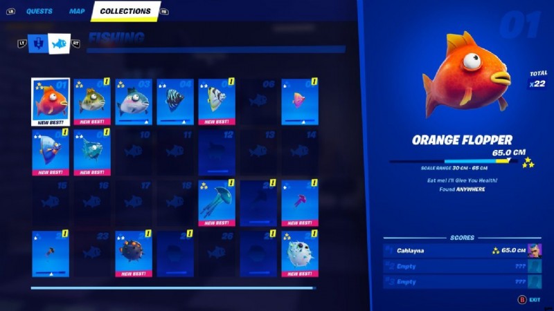 2 番目のコレクション画面は、Fortnite 用です。 魚。全部で28基あるので、のんびり湖に浮かびたい人はぜひ釣りに出かけてみてくださいね!魚ごとに最大 3 つのスコアを保存でき、収集するものがたくさんあるので、手遅れになる前に始めましょう!