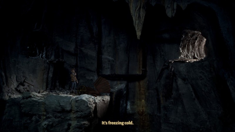 洞窟が浸水し、割れ目に落としたトロッコに飛び乗れるようになります。トロッコを使って画面の右側に渡り、壊れたレールを使って登ってシーンを終了します。