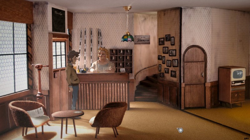 ゲストハウスに戻ります。画面の右端に行くと、テレビを見ている女の子がいます。テレビを使ってみると、レニと自己紹介する女の子と話し始めます。レニとの会話が終わる頃には、彼女の叔父には秘密があることがわかります。彼女に秘密を明かさせるには、彼女と一緒にレコーダー デバイスを使用します。レニの叔父の隠し場所の場所を学びます。