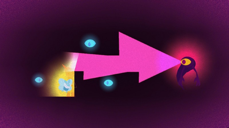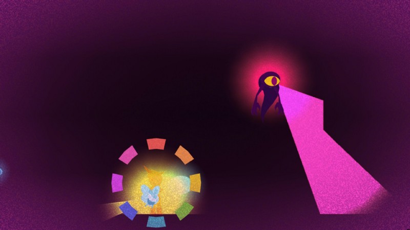 Enter the place to find yourself in pitch darkness. You can use your singing-light to spot ledges and platforms, but otherwise, you’ll have to walk around in the dark. Head right and up as required, until you find a purple monster. The monster has a pink cone of vision that you want to avoid at all costs. Thankfully, the monster can’t see your singing-light, so feel free to sing as you wish.