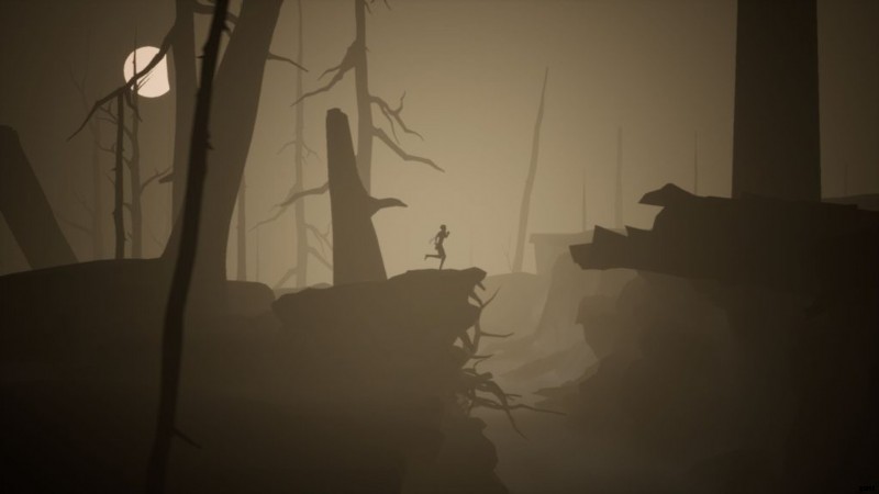 根こそぎにされた木にたどり着くと、別の影が見つかります。根こそぎにされた木の陰に隠れ、影が反対方向を向いたら、右に走ります。影が背を向けても、隠れて移動し続けます (影がどこを見ているかを知るために、光る目に注意してください)。