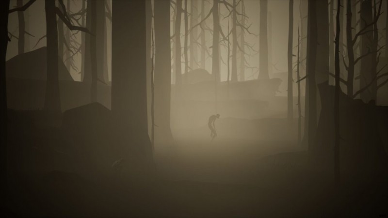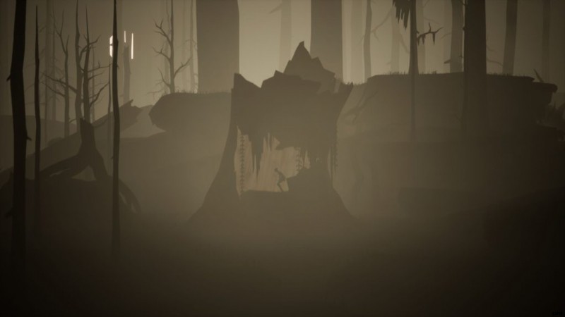 大きな木の切り株と影に出くわしたら、木の切り株の後ろに隠れてそこにとどまります。影が背を向けてカメラと反対方向に歩き始めたら、右に走ってください。