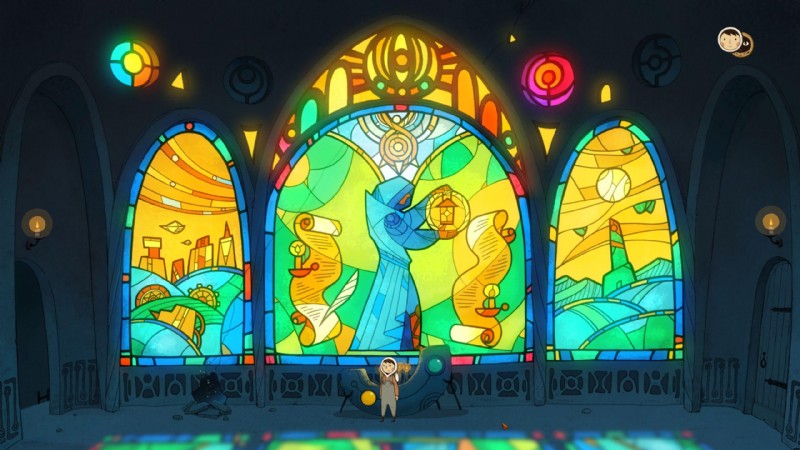 üri に切り替えて、ひざまずいているエンティティの右側のステンド グラスに剣が見えるまで、黄色のオーブを繰り返し押します。次に、シンボルが下向きの 3 つのスパイクを持つシンボルに切り替わるまで、青いオーブを繰り返し押し続けます。正しく行うと、上部の円形の窓の 1 つが点灯します。